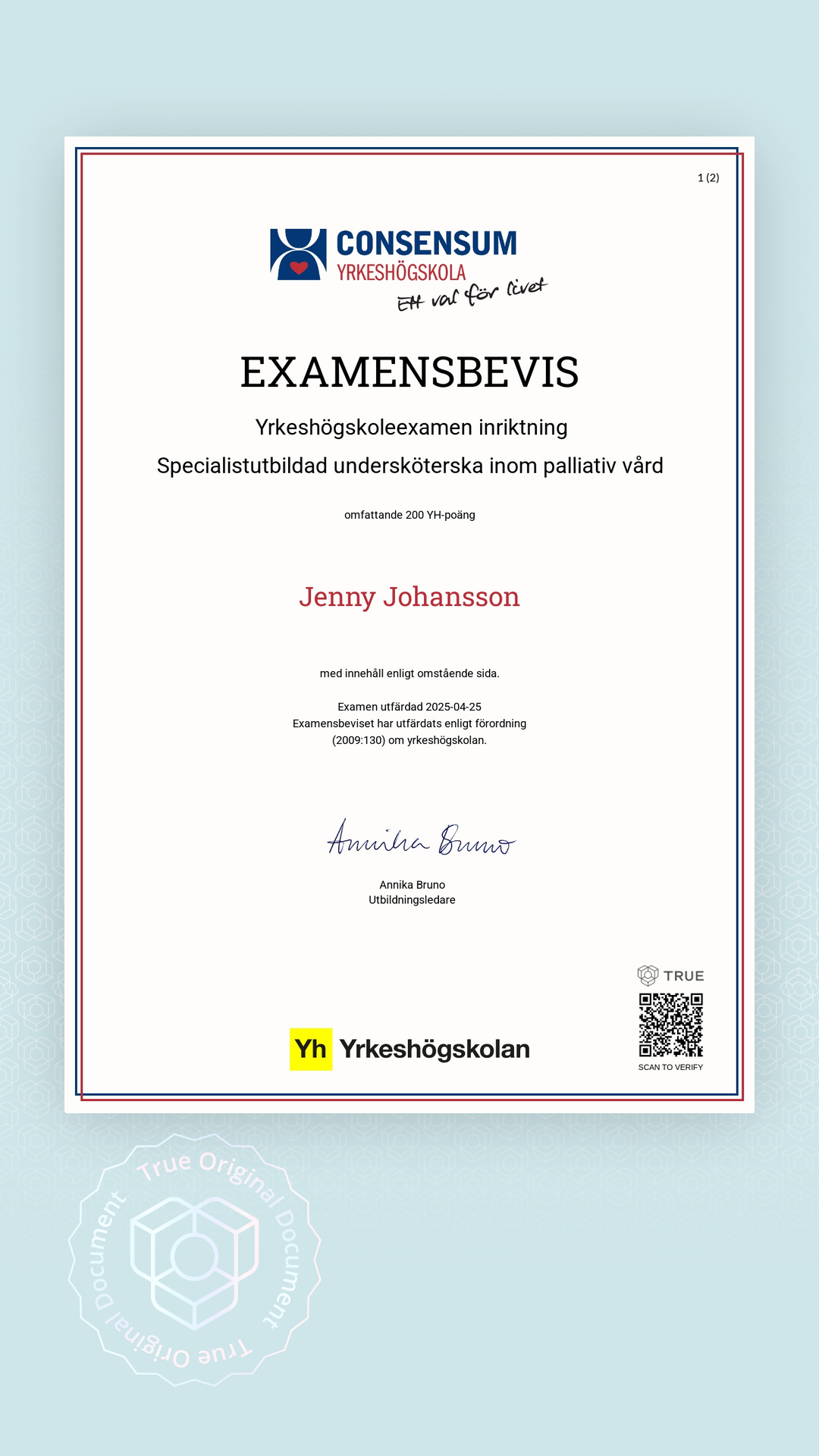 Alla TRUE -document är säkrade med blockchain-teknologi och kan verifieras som äkta. Klicka på verifieringsknappen bredvid dokumentet eller skanna QR-koden med din smartphones kamera. Ingen app krävs - dokumentets äkthet verifieras omedelbart.